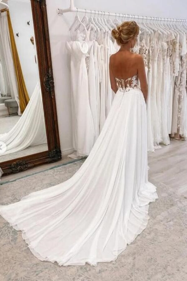 Chiffon A Line Sweetheart Strapless Lace Appliques Wedding Dresses, PW515