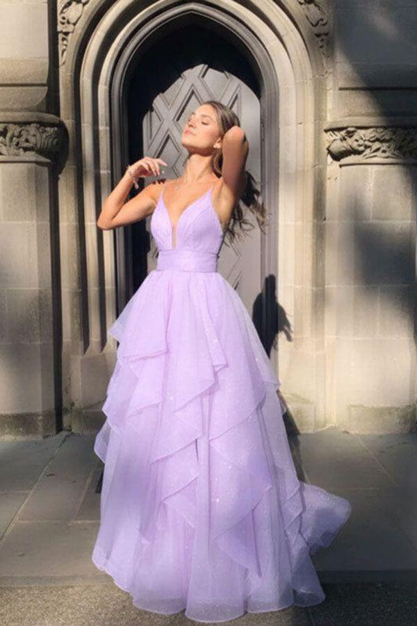 Glittery Purple Tiered Tulle A Line Spaghetti Straps Prom Dress, Evening Dress, PL760