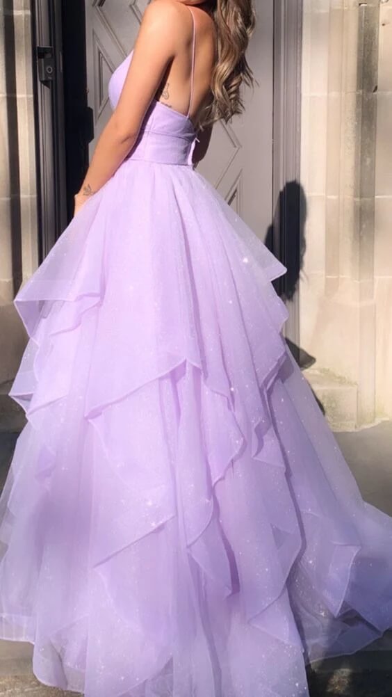 • Glittery Purple Tiered Tulle A Line Spaghetti Straps Prom Dress, Evening Dress, PL760